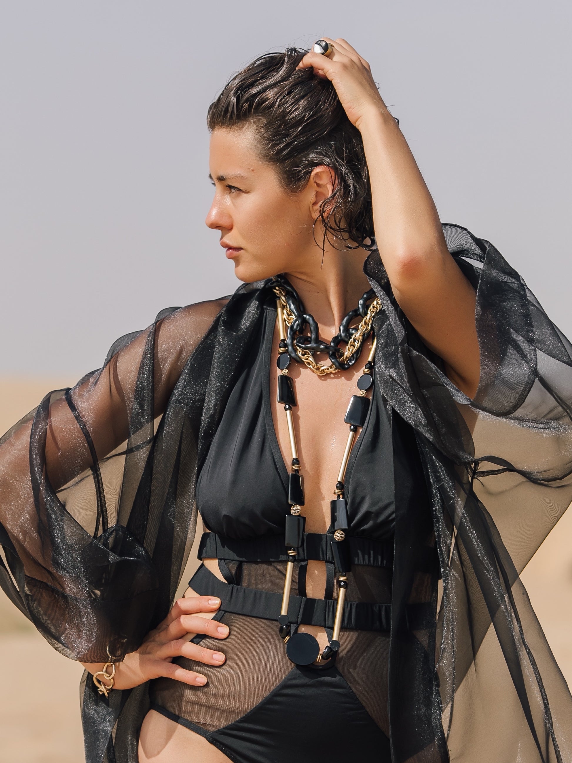 Wear it on various occasions - from beach parties to posh gala dinners, the Cleo necklace effortlessly adapts to any setting, always adding a touch of elegance. It pairs perfectly with black attire.
