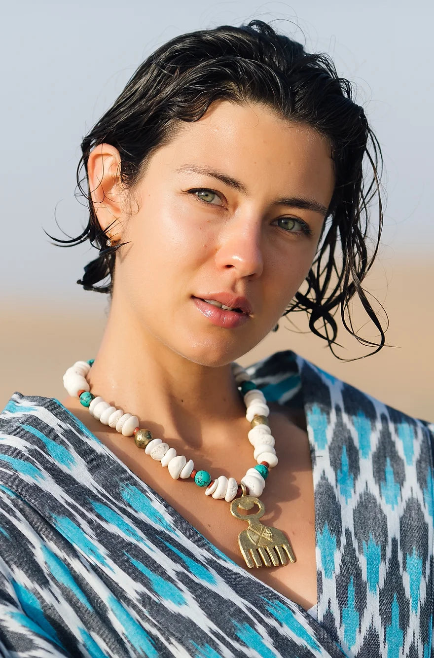 We shot the Nala necklace in the desert, paired with a beautiful kimono made from original Uzbek Ikat, and we absolutely love the result. What would you wear it with?
