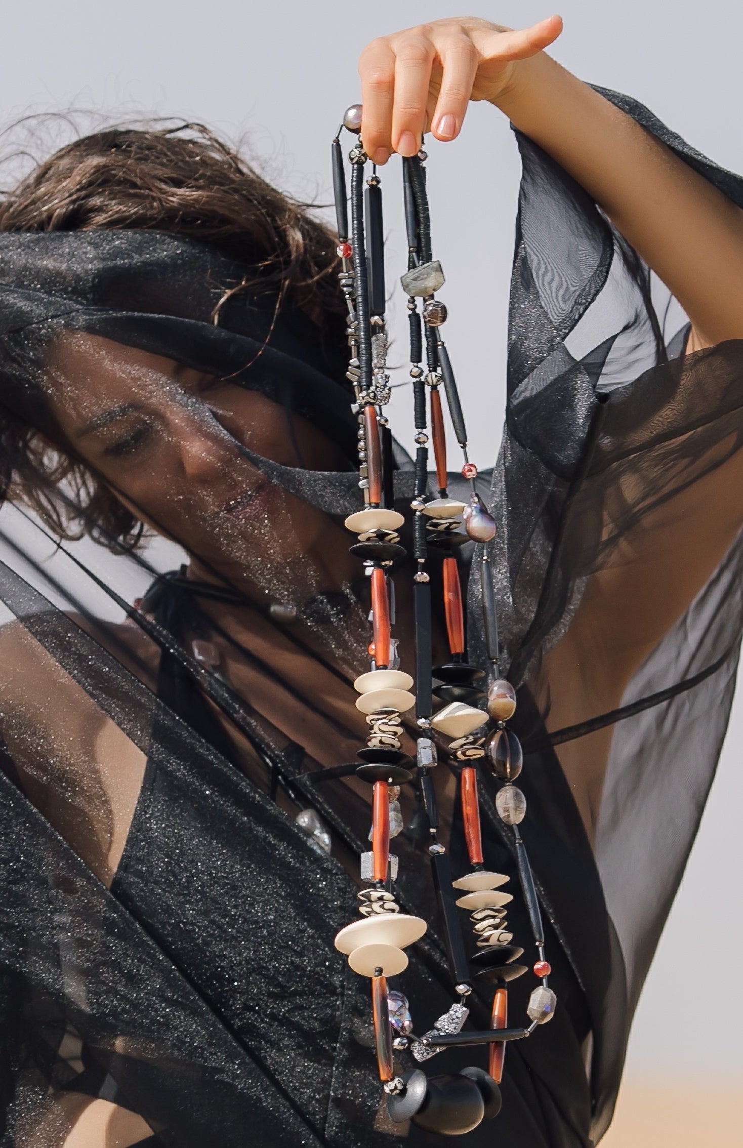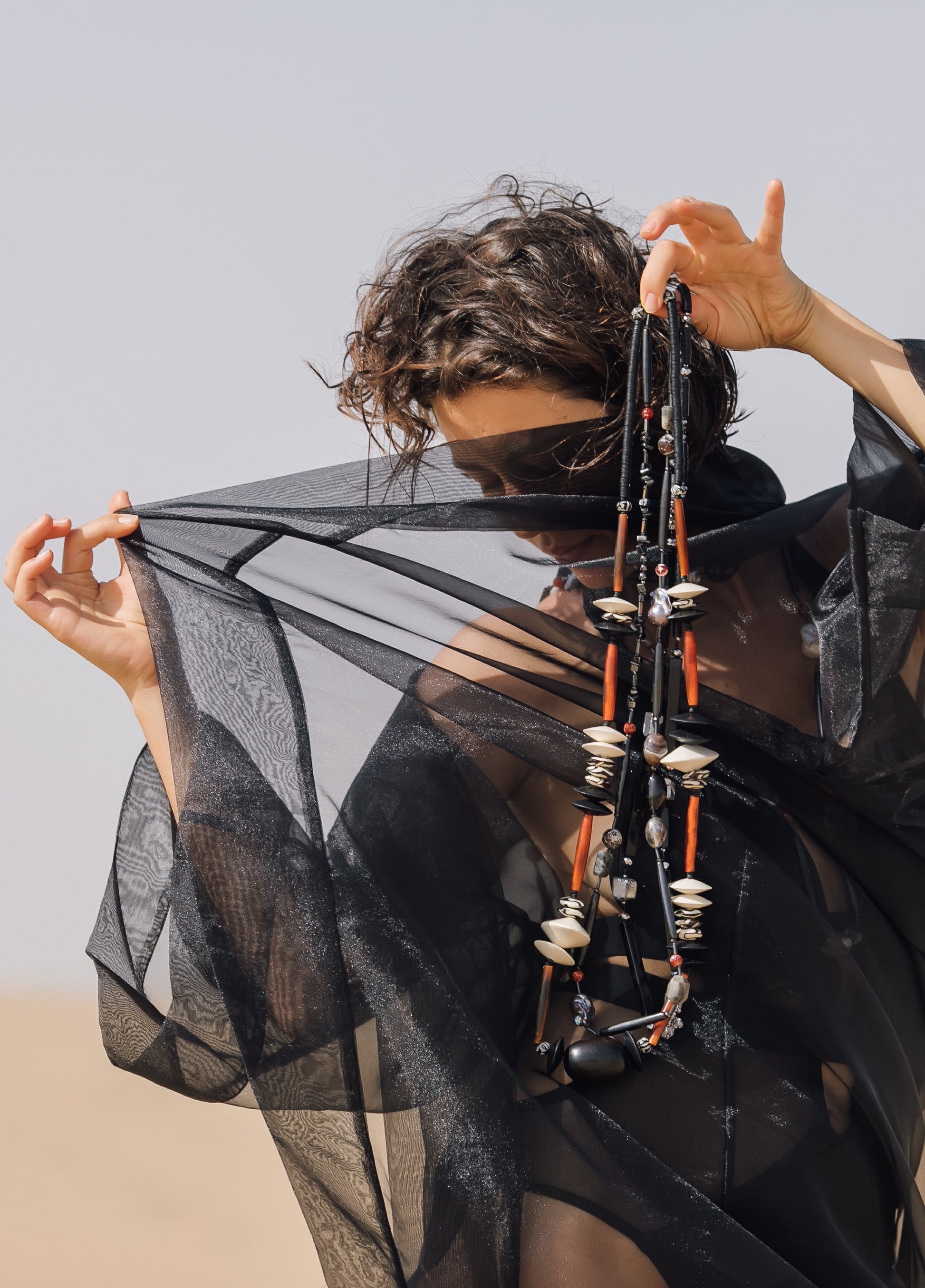 Perfect to wear with a long dress of a simple silhouette, the Tiana necklace truly shines. We experimented with black during the photoshoot and loved the result. Personally, I enjoy pairing the Tiana necklace with an oversized white shirt and jeans.