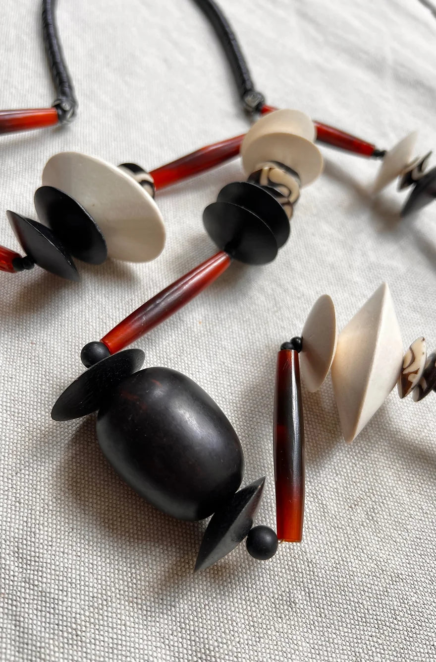 Tiana Long Necklace. Wood, Buffalo Horn, Batik Bone Beads