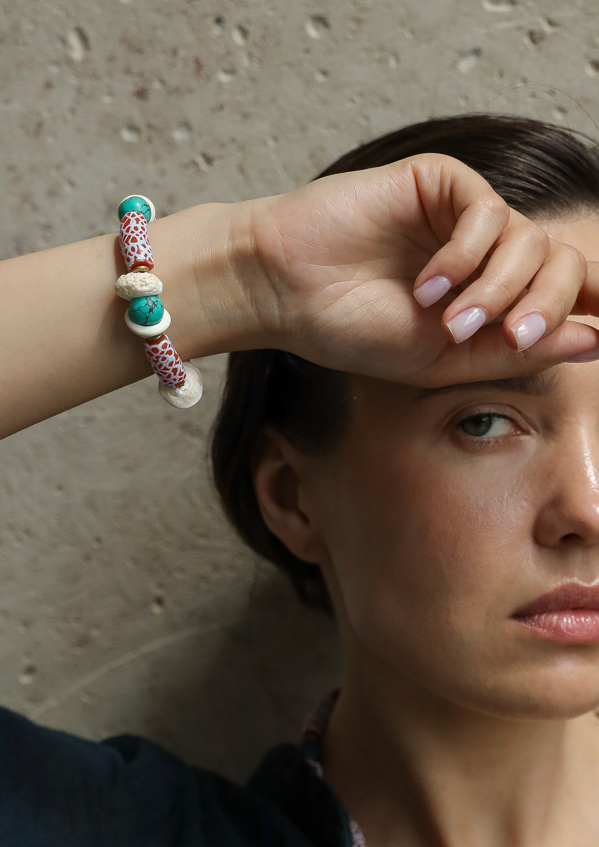 Zuri Bracelet.Hand-painted recycled glass beads, Howlite, Sea Shell